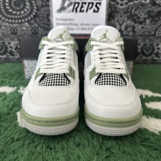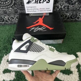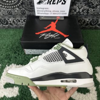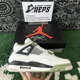 The Women’s Air Jordan 4 Retro ‘Seafoam’ merges OG-inspired color blocking with updated pastel accents, echoing the 1989 ‘Fire Red’ release. It features smooth white leather with Oil Green accents on the eyelets, interior lining, and Jumpman branding on the tongue tag and molded heel tab. Legacy elements like the quarter panel netting and support wings remain intact. The classic silhouette is finished with a polyurethane midsole, visible Air-sole unit in the heel, and additional green detailing on the forefoot.