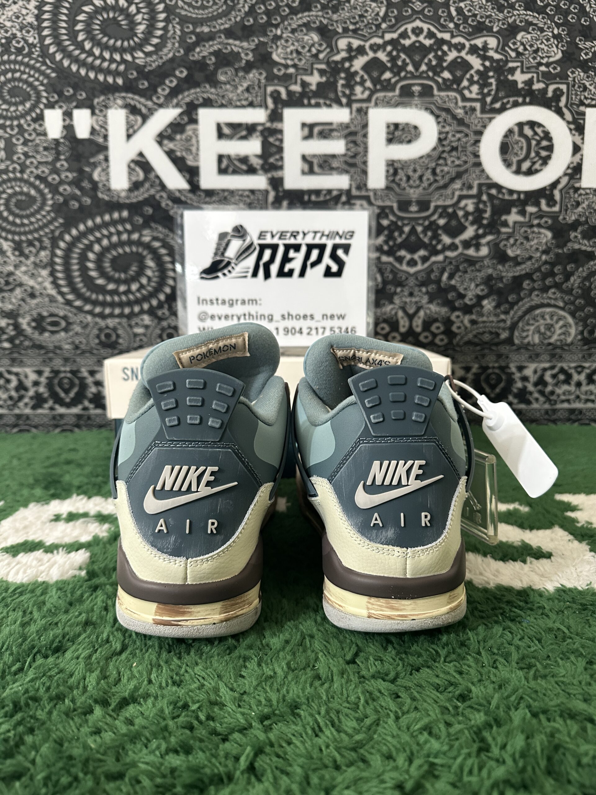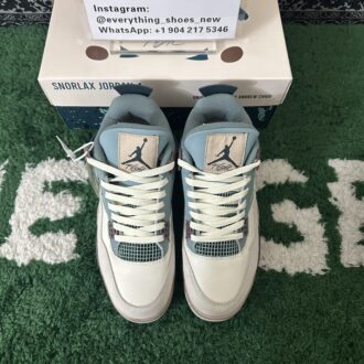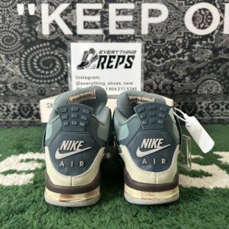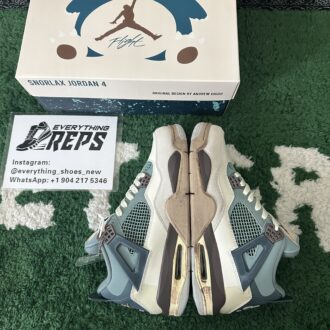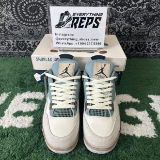 The Air Jordan 4 “Snorlax Custom” features a two-tone upper in blue and beige, divided into top and bottom sections. Darker color patches create a 3D effect, mimicking Snorlax’s rounded shadows. The design is elevated with brown Air-assisted midsoles and beige/gray rubber outsoles, reflecting the Pokémon’s feet.