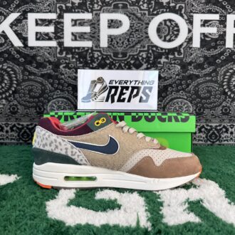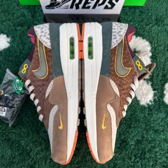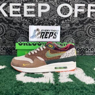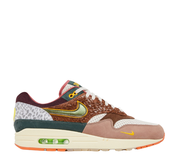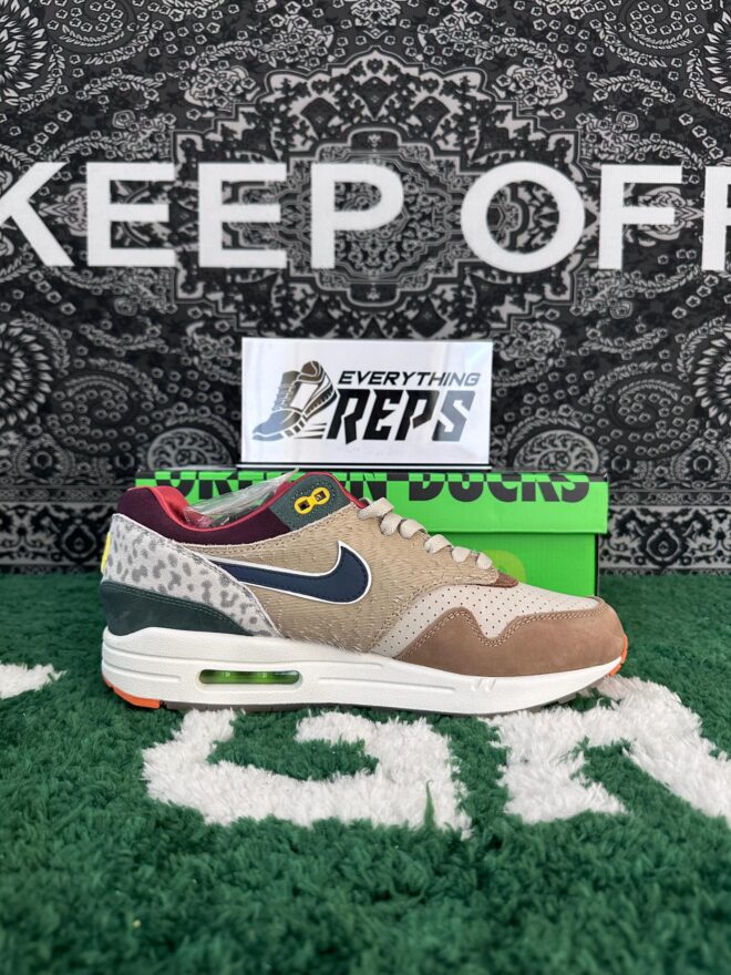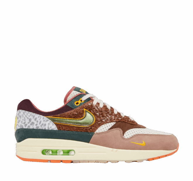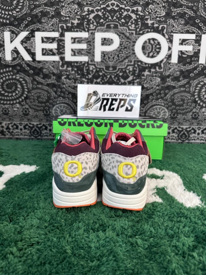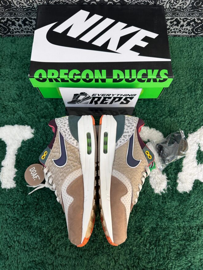The Nike Air Max 1 ’87 Luxe University of Oregon PE showcases a striking design inspired by the Oregon Duck mascot. Featuring a mismatched upper with iridescent brown textiles at the toebox and green accents at the collar, these sneakers capture the vibrant spirit of the Pacific Northwest. Perforated tan leather overlays and beige suede on the mudguard add a luxurious texture, while white and gray leopard print eyestays and a mottled brown suede heel counter elevate the aesthetic. A bold blue Swoosh graces the side, complemented by a miniature Swoosh embroidered on the lateral toecap for a signature Nike touch.