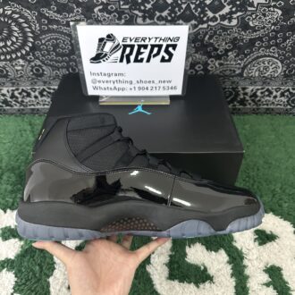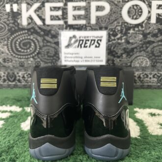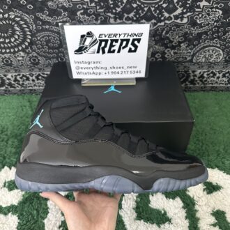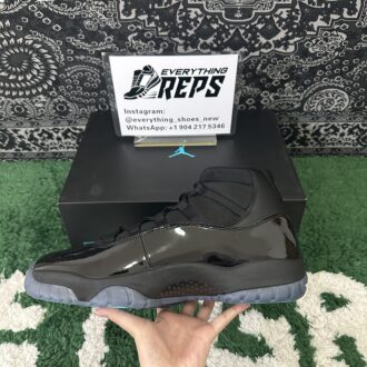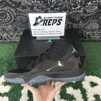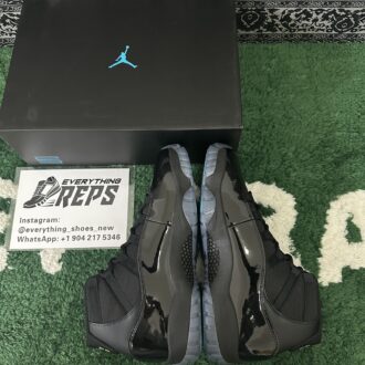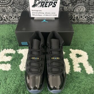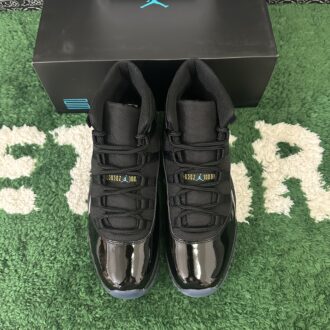 The Air Jordan 11 Retro ‘Gamma Blue’ was the 2013 holiday release from Jordan Brand. This non-OG colorway features a sleek black upper made from ballistic mesh and shiny patent leather. Pops of color come from the turquoise Jumpman logo and Varsity Maize ‘23’ on the heel tab. The design includes a cushy Phylon midsole with a full-length Air unit, a carbon fiber spring plate, and a translucent rubber outsole with herringbone traction pods for superior grip.