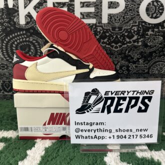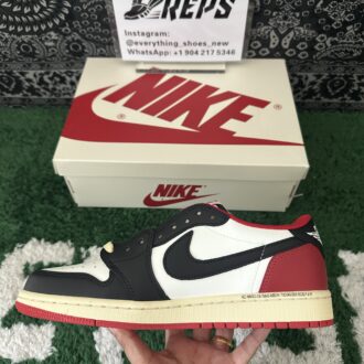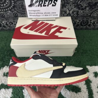 Travis Scott’s collaboration with Jordan Brand continues with the Air Jordan 1 Low Black Red. This sneaker blends classic Jordan aesthetics with Travis Scott’s unique style, featuring a black leather upper, red Swoosh, tongue, and outsole. The Cactus Jack branding appears on the tongue, insole, and heel. Notable details include practical shoelaces and a reverse Swoosh logo with side embroidery, offering a distinctive look.