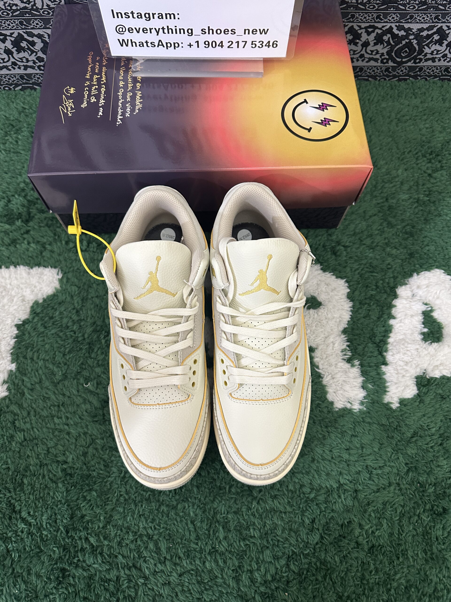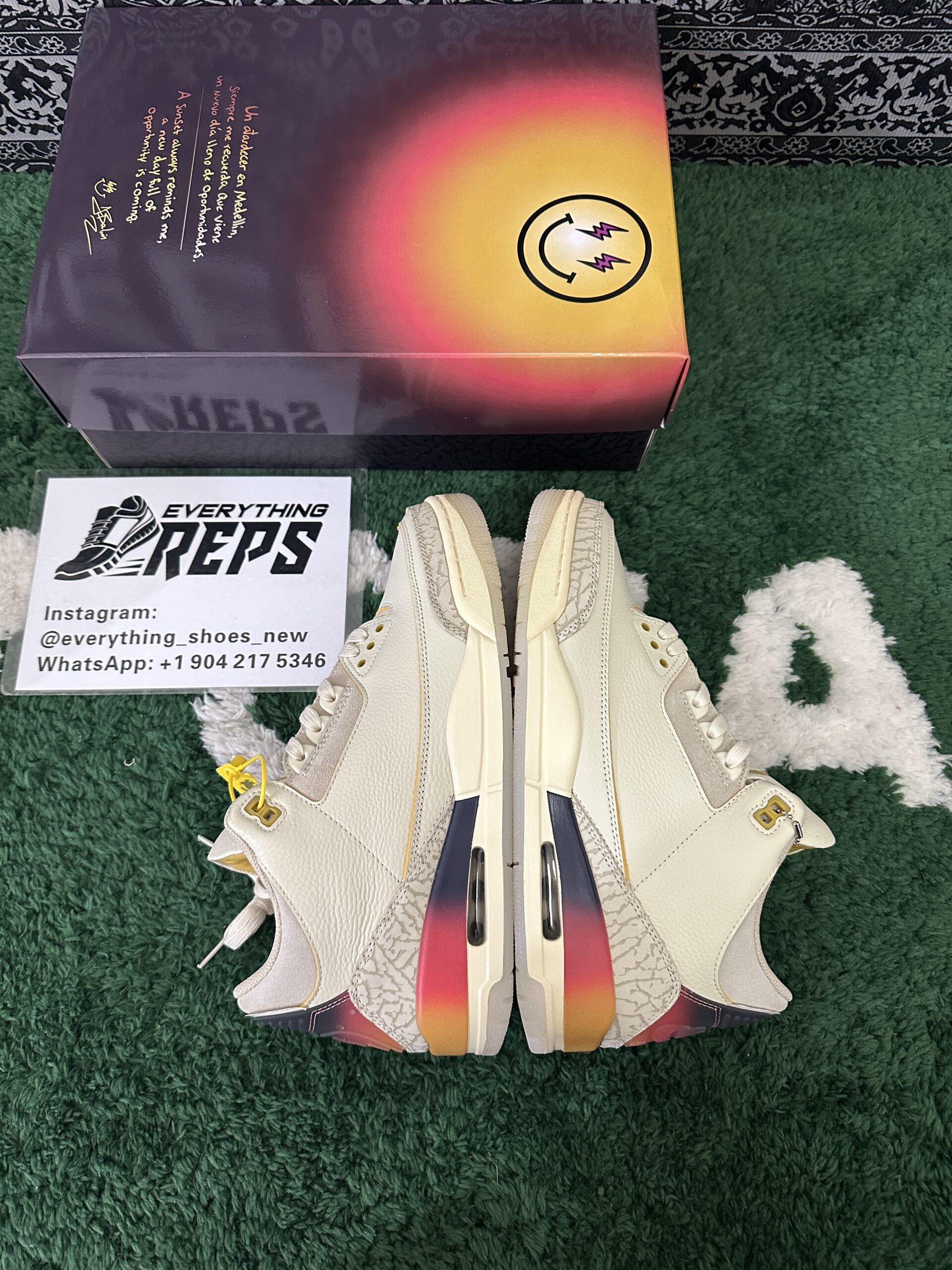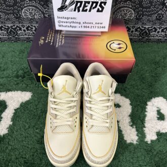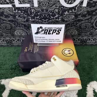 The design is finished with a blue-tinted translucent rubber outsole, adding a modern and dynamic flair. A perfect blend of heritage and creativity, the J. Balvin x Air Jordan 3 Retro Medellín Sunset is a must-have for fans of the artist, collectors, and anyone seeking a bold and meaningful sneaker.