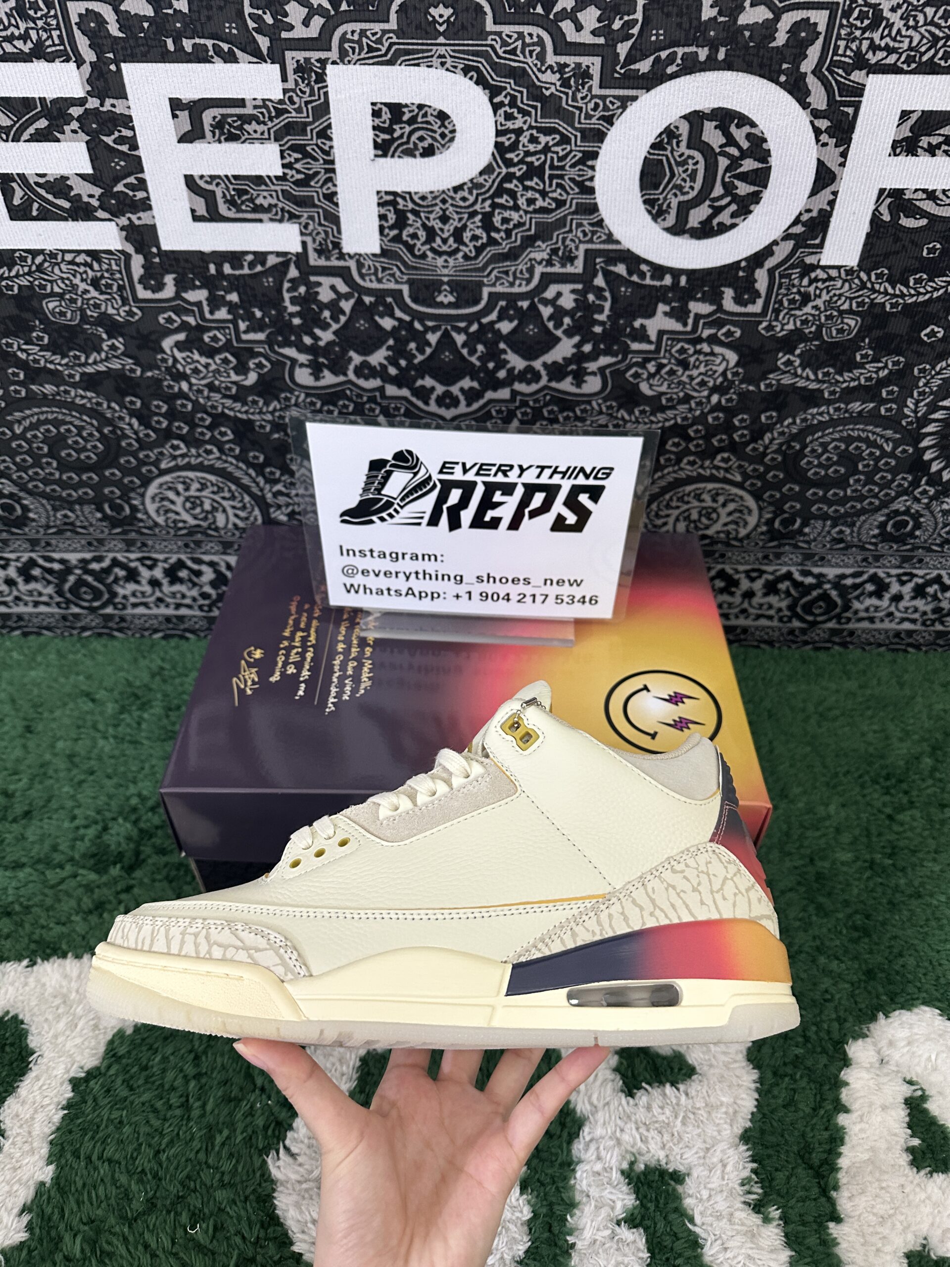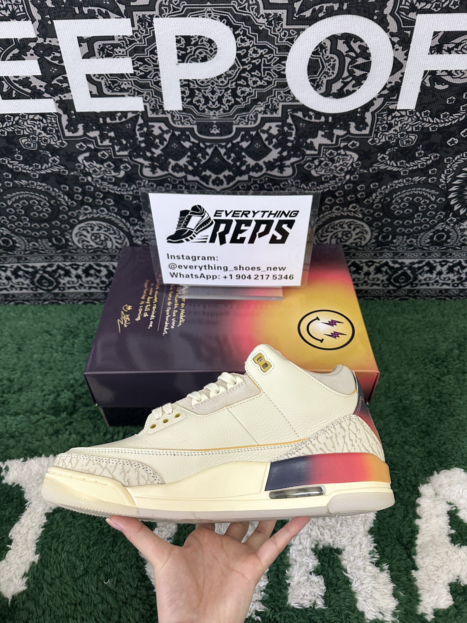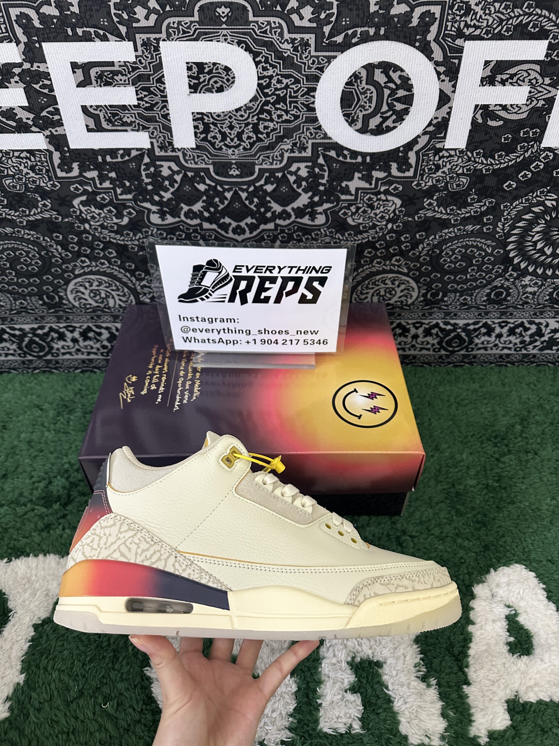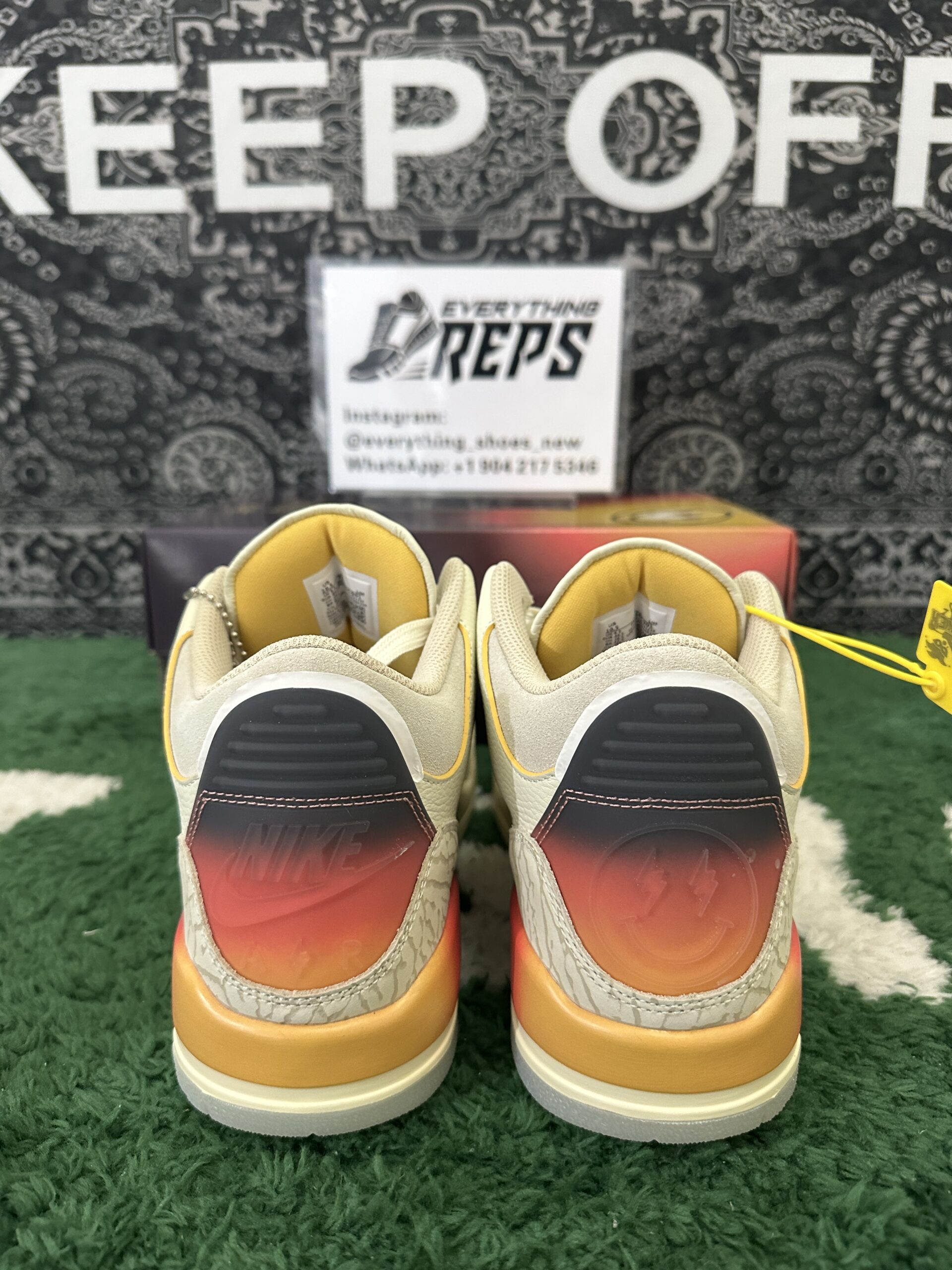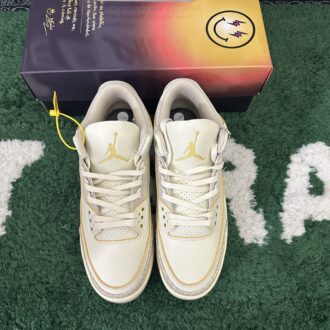 J. Balvin x Air Jordan 3 Retro Medellín Sunset features an ivory leather upper, complemented by tonal elephant print overlays on the forefoot and heel for a subtle yet refined texture. The standout element is the gradient midsole and back tab, which transition beautifully from yellow to orange and dark purple, evoking the hues of a Medellín sunset. Unique branding details include mismatched back tabs—Nike branding on the left shoe and J Balvin’s signature smiley face icon on the right—while an embroidered gold Jumpman logo graces the tongue for a touch of elegance.