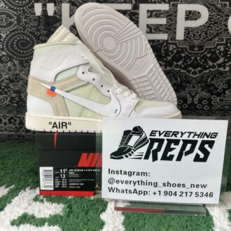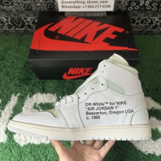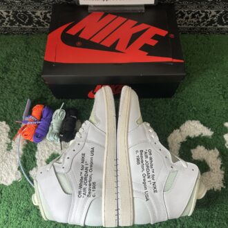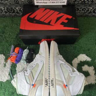 Inspired by classic Air Jordan 1 colorways, the Off-White x Air Jordan 1 Retro High OG ‘White’ 2018 reimagines the iconic ‘Chicago’ theme. Designed by Virgil Abloh, this version features an all-white premium leather and mesh upper with deconstructed Swoosh branding and blue accents. The Wings logo adorns the ankles, while black “AIR” lettering on the midsole, black ‘Off-White™ for NIKE’ text on the side panels, and signature orange tabs complete the design.