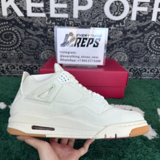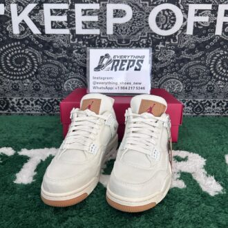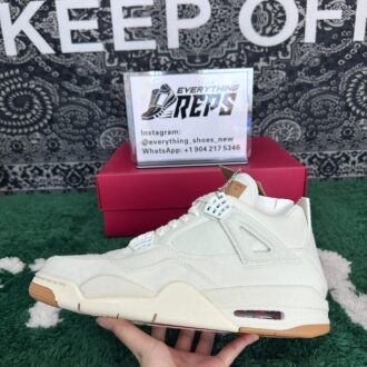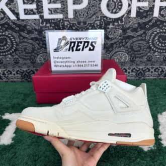 The Levi’s x Air Jordan 4 Retro ‘White Denim’ unites two iconic American brands in a fresh take on the classic silhouette. This reimagined edition features both the upper and midsole dressed in pristine white denim. Levi’s signature red tab and a unique Jumpman logo on the tongue tag, inspired by Levi’s ‘Two Horses’ paper patch, add distinctive branding elements. The design is completed with a gum rubber outsole, providing a complementary contrast to the all-white build.