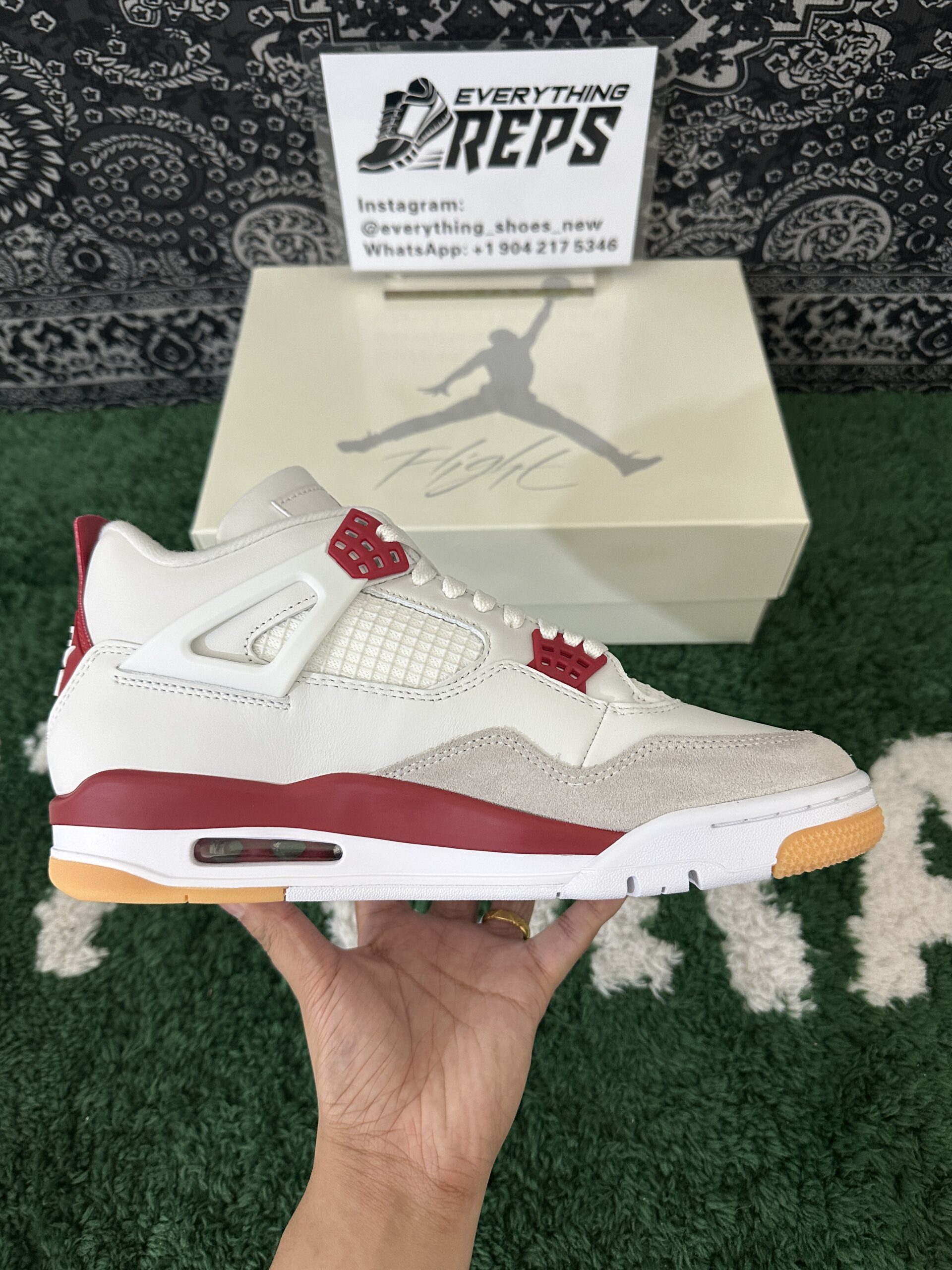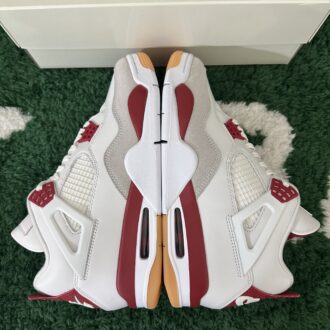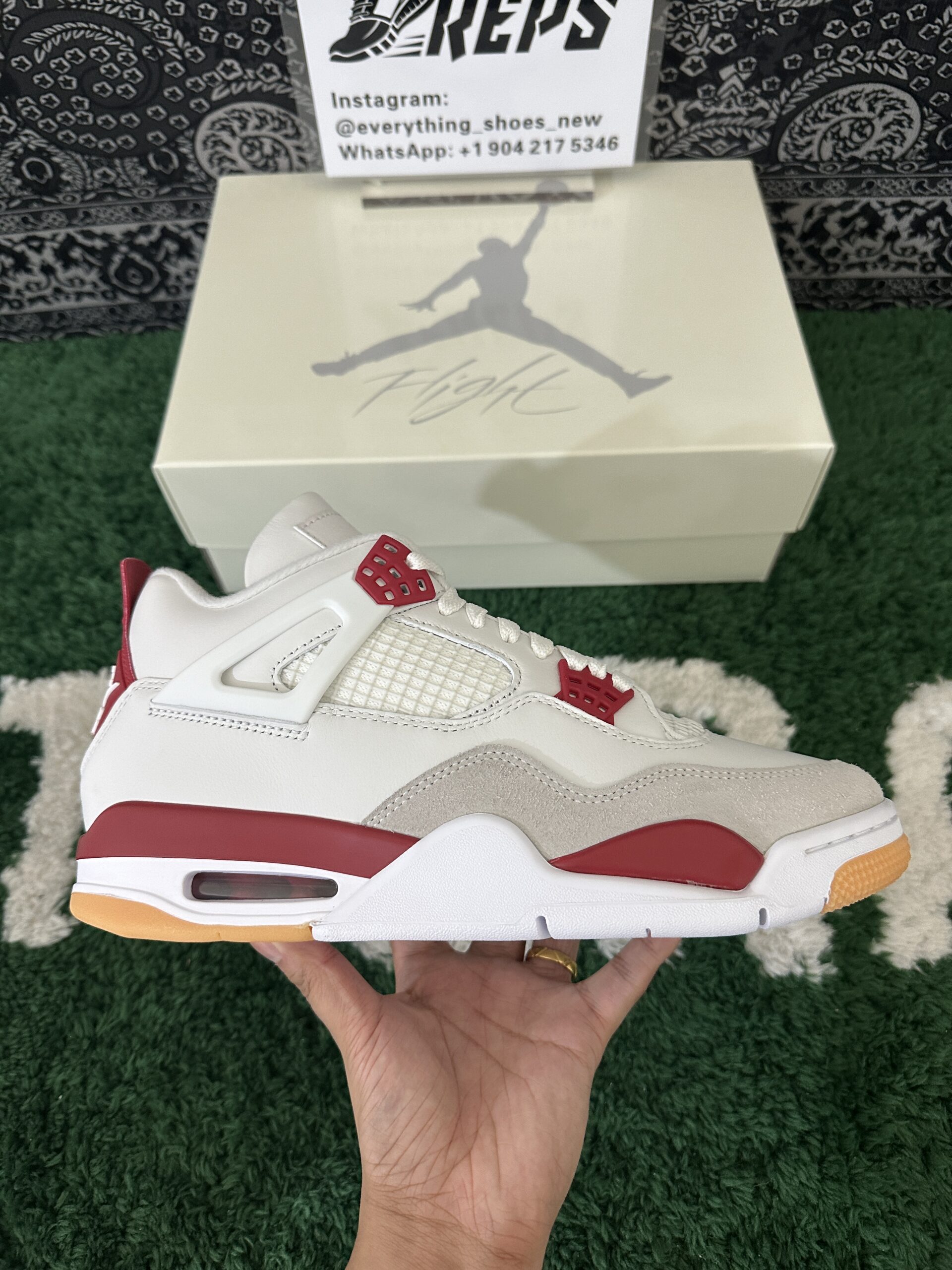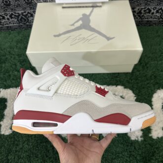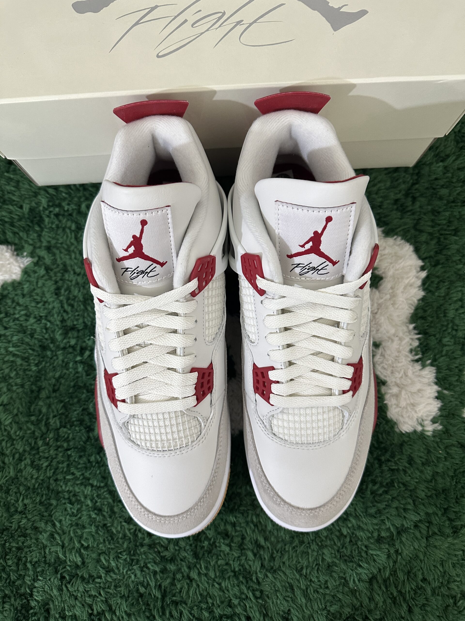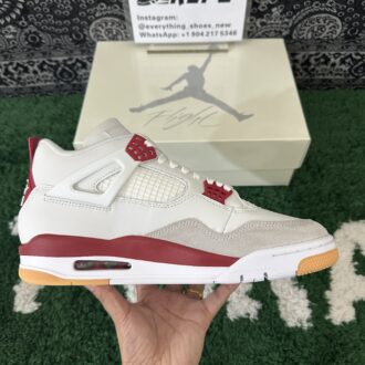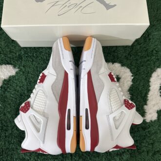 Elevate your sneaker game with the Jordan 4 Retro SB Varsity Red,” a standout collaboration between Nike SB and Jordan Brand that fuses iconic basketball heritage with skate-ready functionality. This exclusive Friends & Family release, unveiled in 2025, boasts a bold Summit White leather upper paired with neutral grey suede overlays, delivering a clean yet striking aesthetic. The vibrant Varsity Red accents steal the show, gracing the molded eyelets, heel tab, and midsole, while the gum rubber outsole adds a timeless touch and superior grip—perfect for skaters and collectors alike.