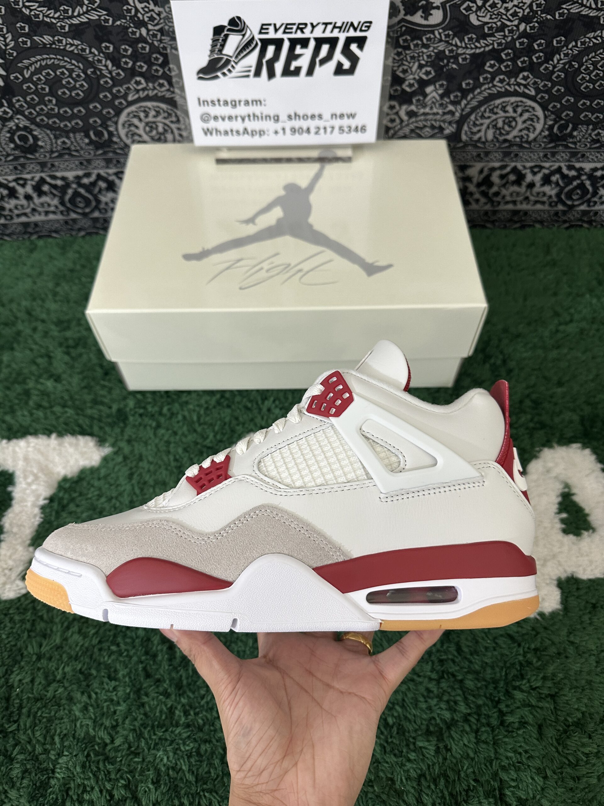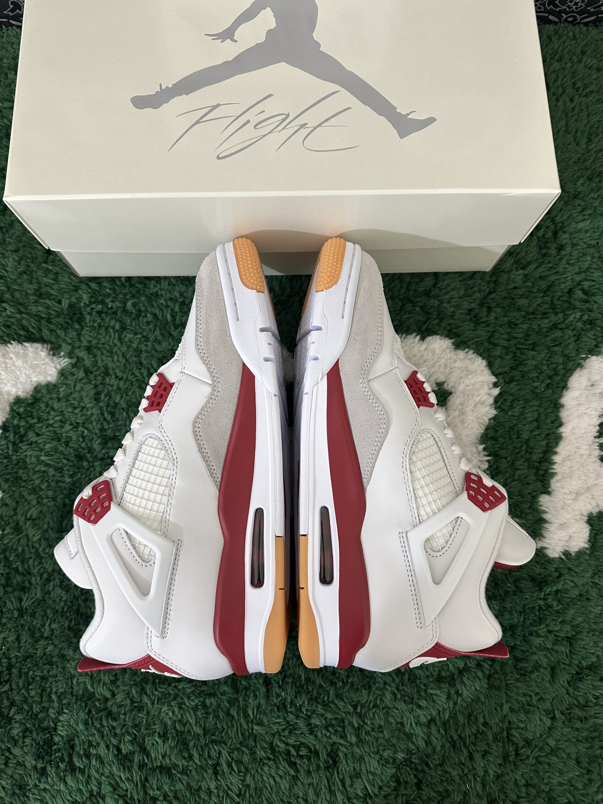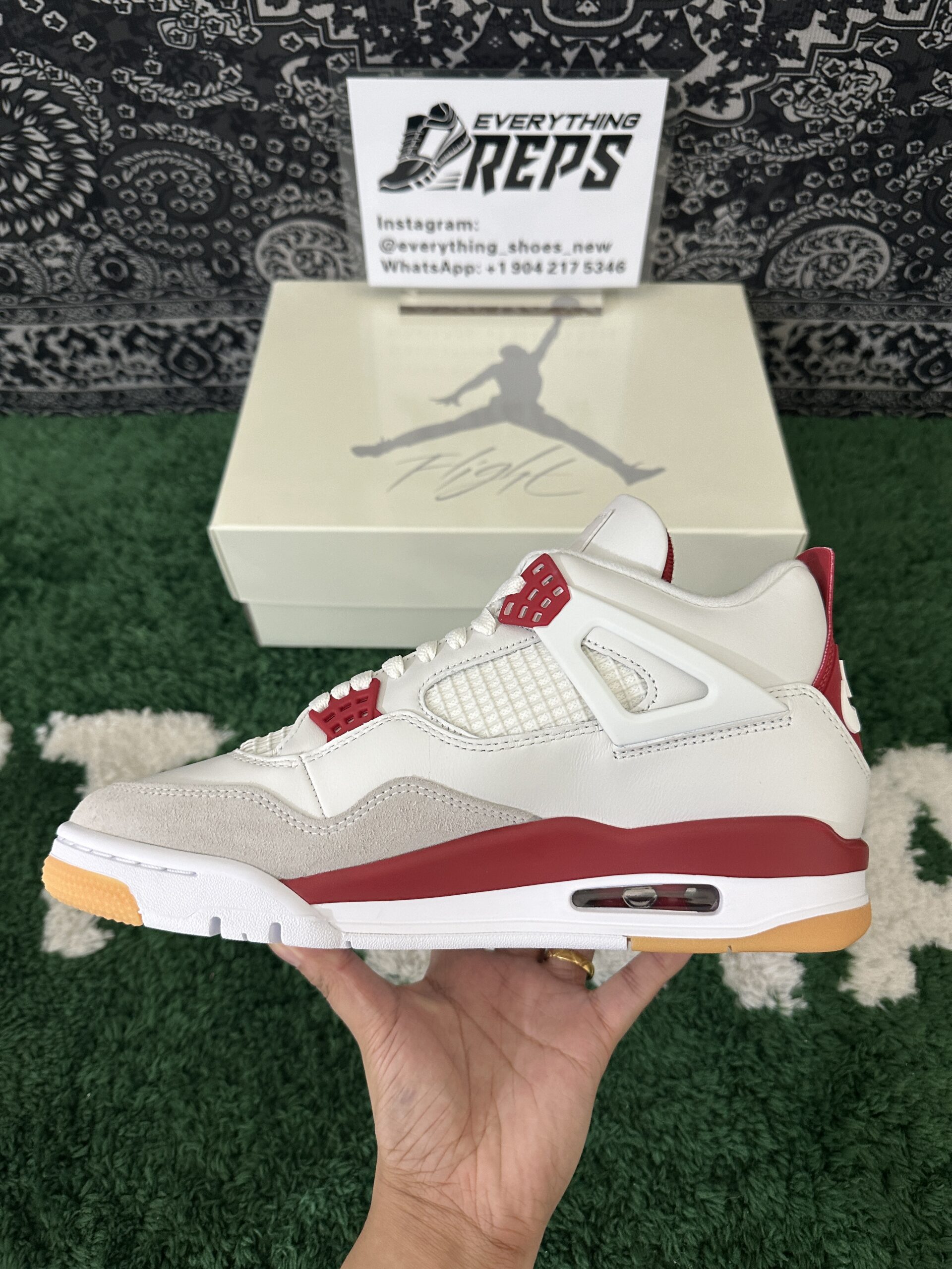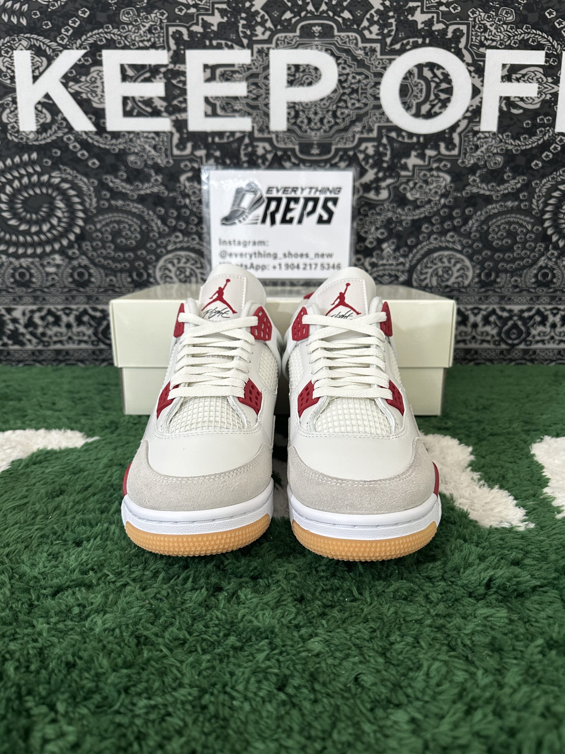 Elevate your sneaker game with the Jordan 4 Retro SB Varsity Red,” a standout collaboration between Nike SB and Jordan Brand that fuses iconic basketball heritage with skate-ready functionality. This exclusive Friends & Family release, unveiled in 2025, boasts a bold Summit White leather upper paired with neutral grey suede overlays, delivering a clean yet striking aesthetic. The vibrant Varsity Red accents steal the show, gracing the molded eyelets, heel tab, and midsole, while the gum rubber outsole adds a timeless touch and superior grip—perfect for skaters and collectors alike.