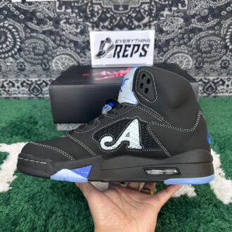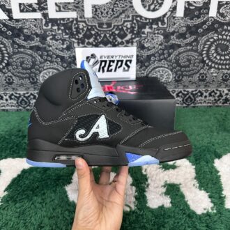 Premium Design: Crafted with a sleek black tumbled leather upper, these sneakers exude sophistication and durability, mirroring the original Air Jordan 5’s timeless silhouette.