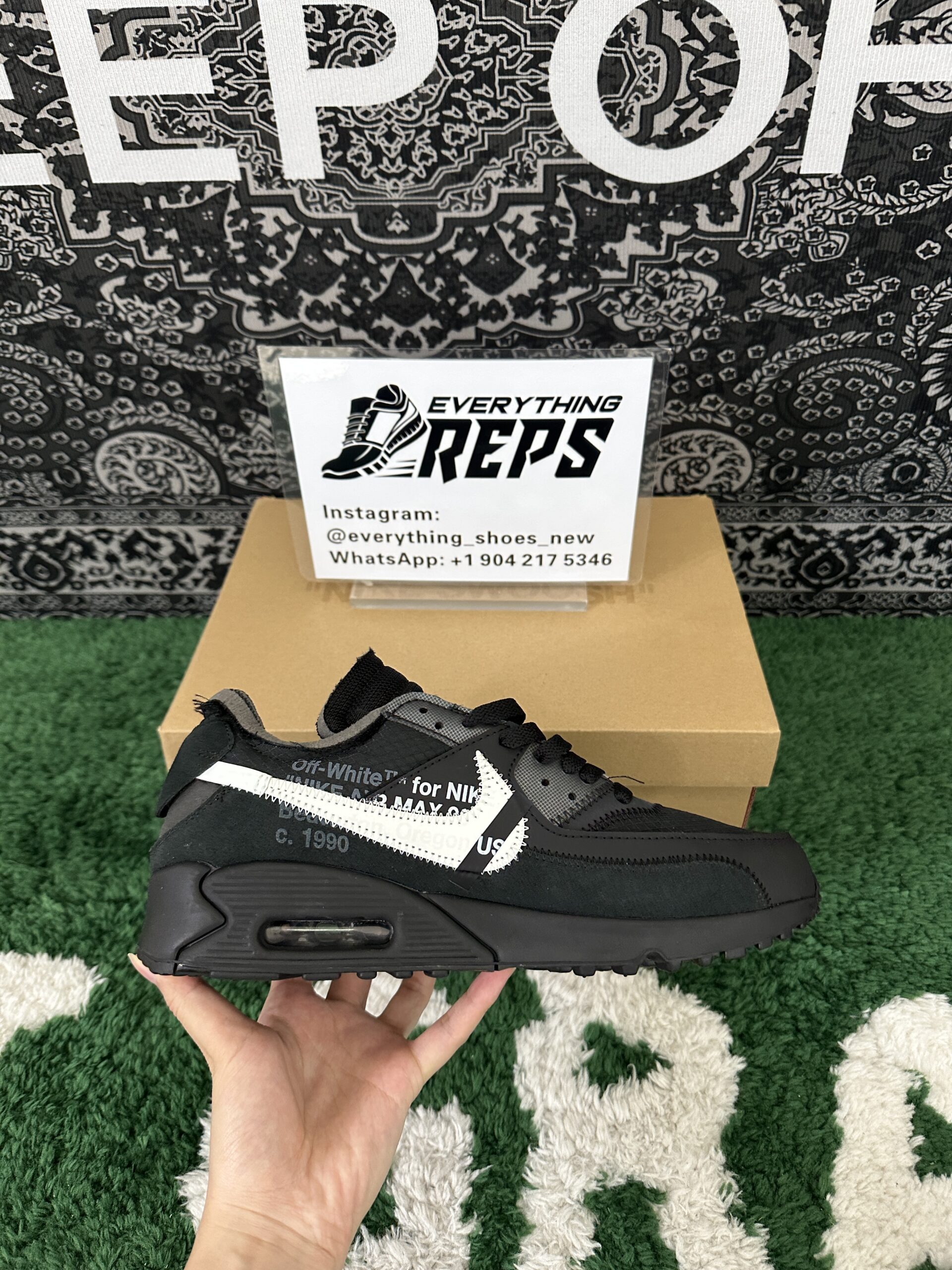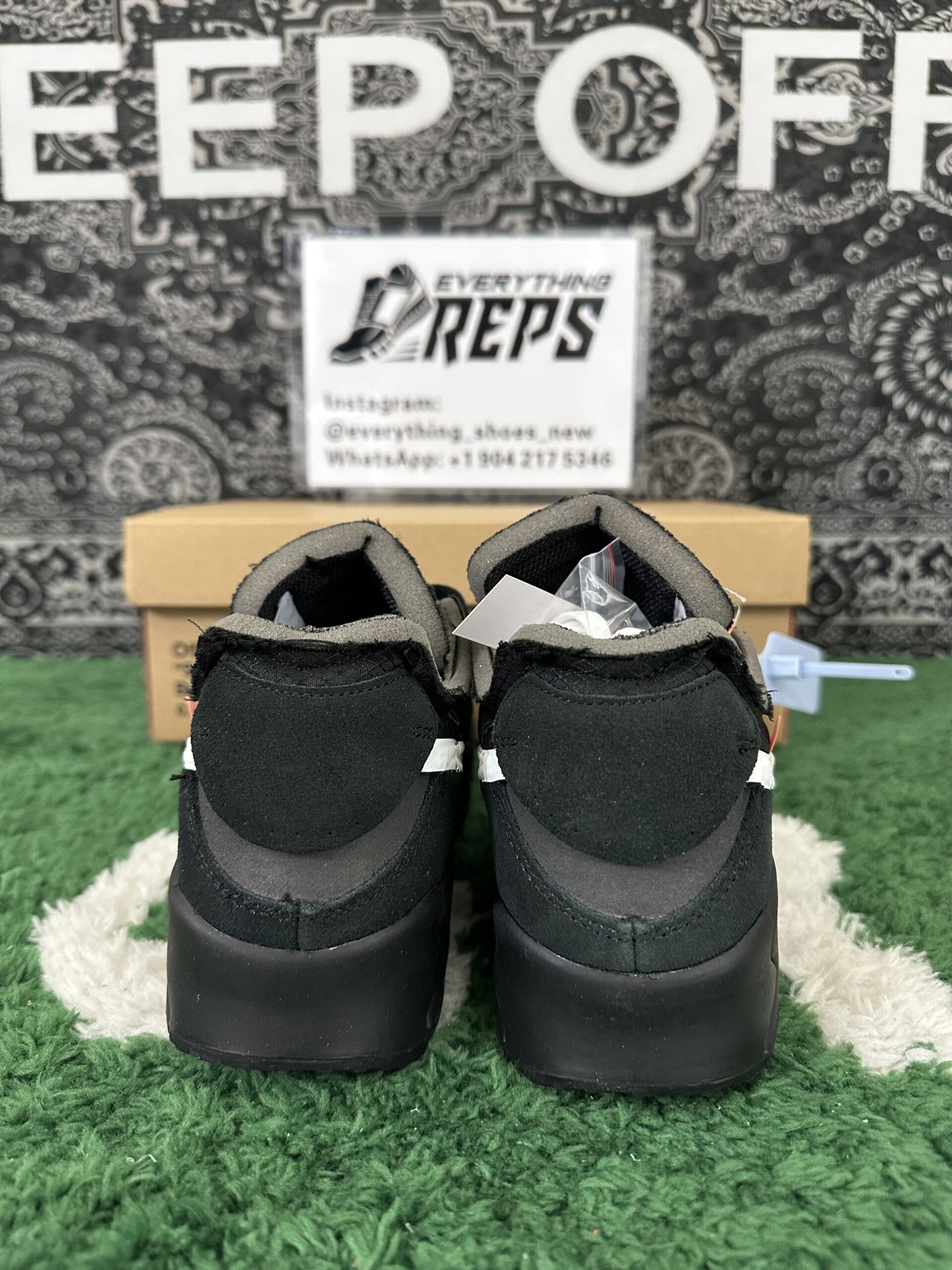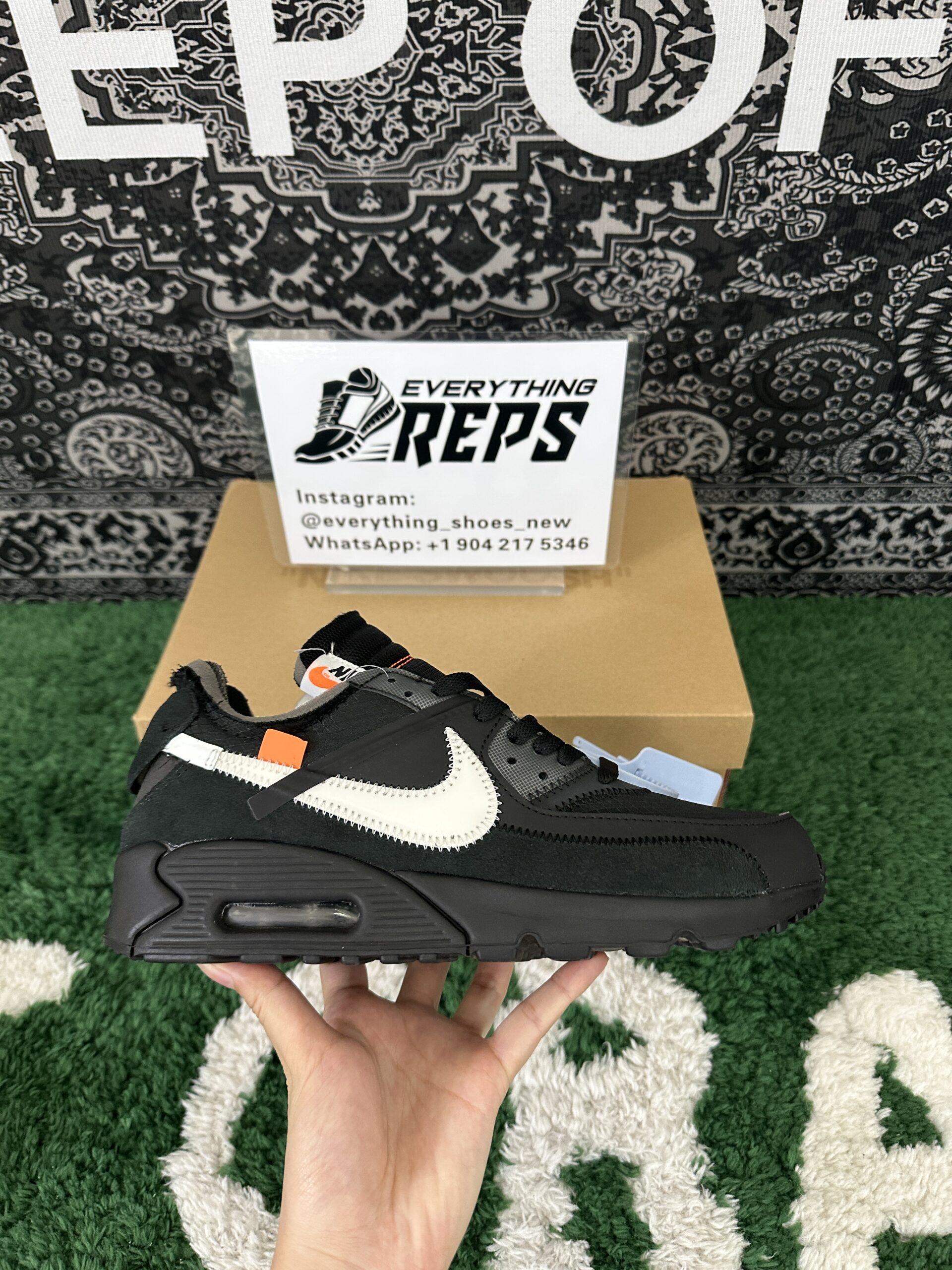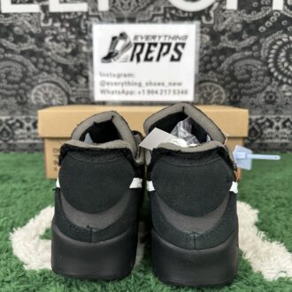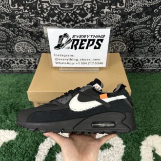 The Off-White x Air Max 90 ‘Black’ showcases a distinct mix of materials, featuring a ripstop fabric base paired with nubuck overlays and a suede mudguard. The sleek black design is highlighted by a white Swoosh, accented with zigzag stitching, while an orange tab and stitching on the exposed-foam tongue add a pop of color. Virgil Abloh’s signature touch is evident in the text block that appears on the medial side of the shoe.