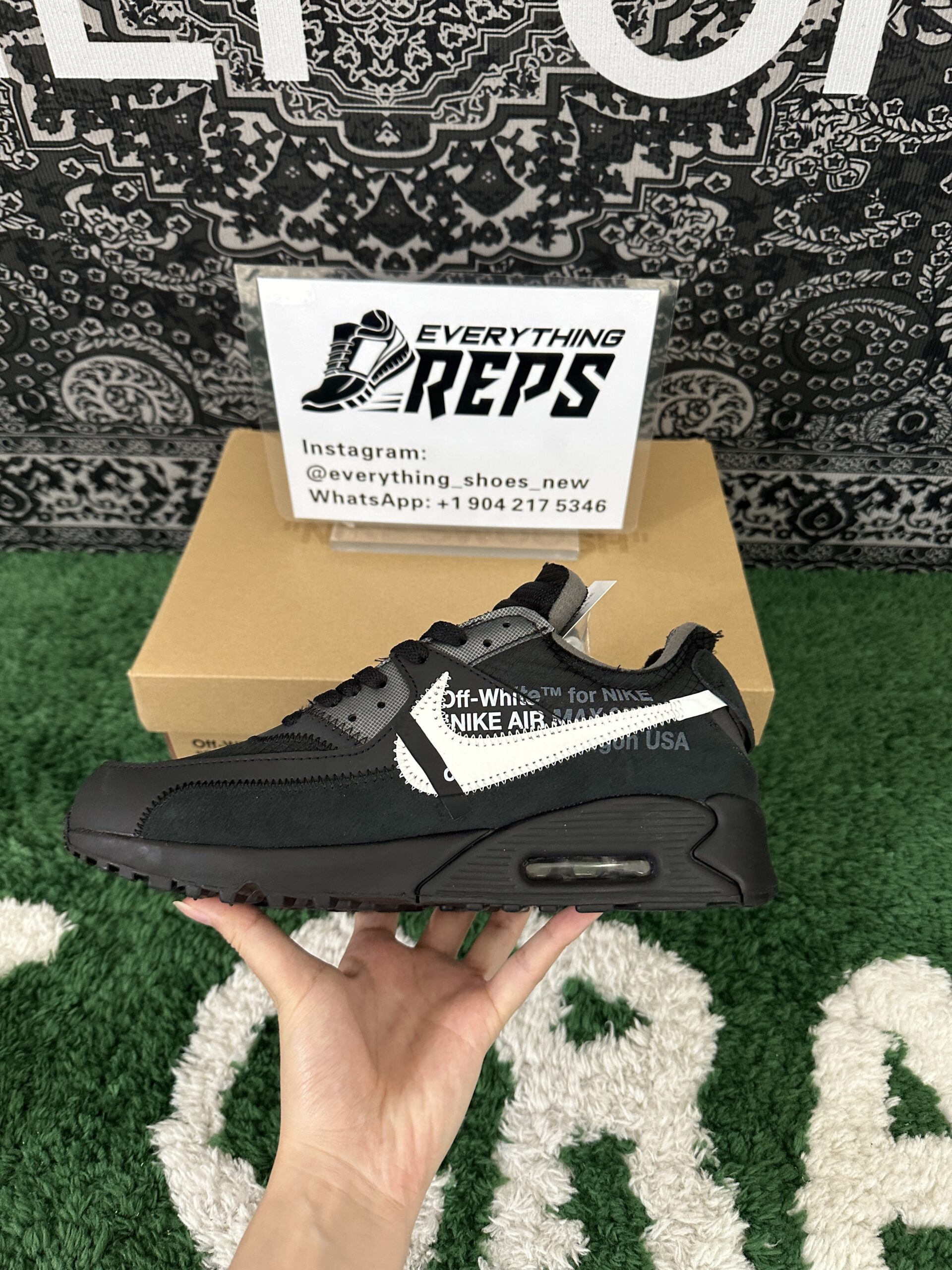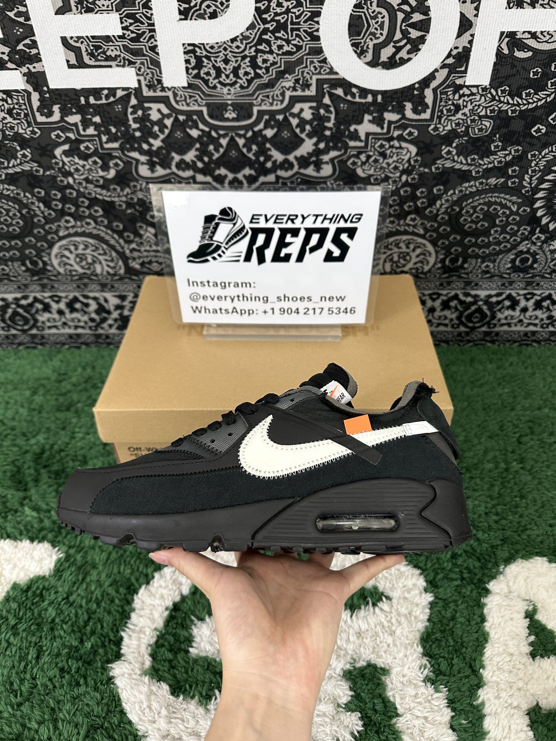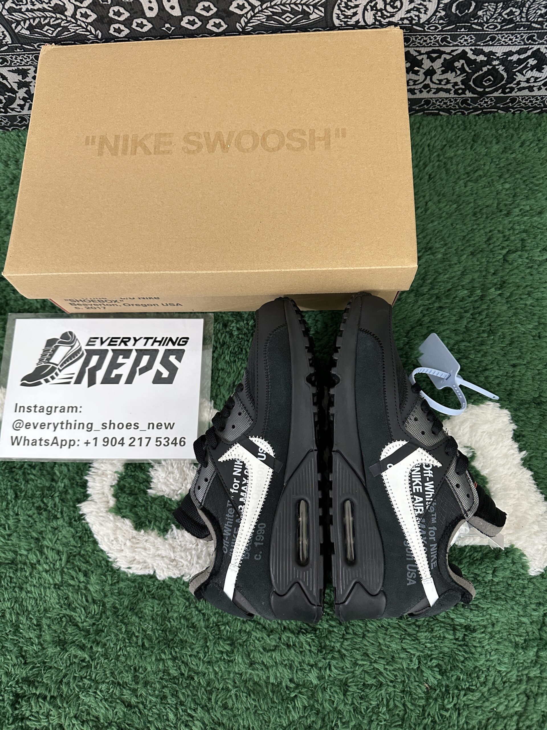 The Off-White x Air Max 90 ‘Black’ showcases a distinct mix of materials, featuring a ripstop fabric base paired with nubuck overlays and a suede mudguard. The sleek black design is highlighted by a white Swoosh, accented with zigzag stitching, while an orange tab and stitching on the exposed-foam tongue add a pop of color. Virgil Abloh’s signature touch is evident in the text block that appears on the medial side of the shoe.