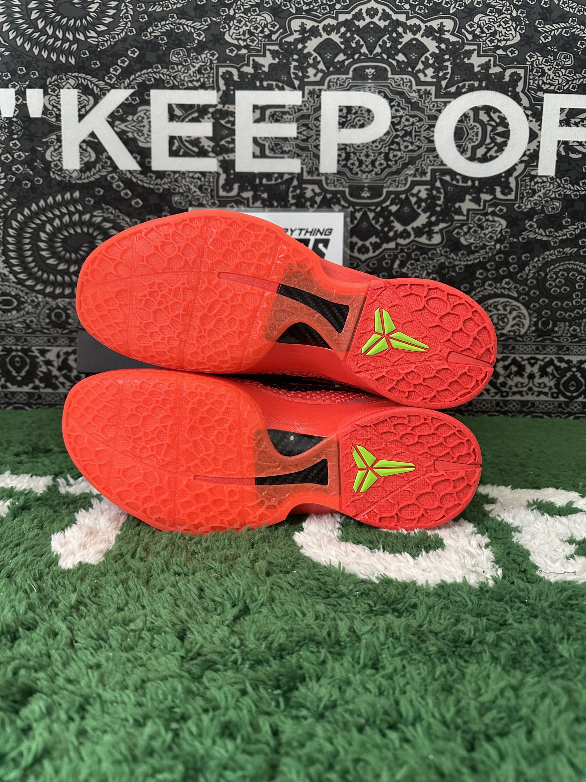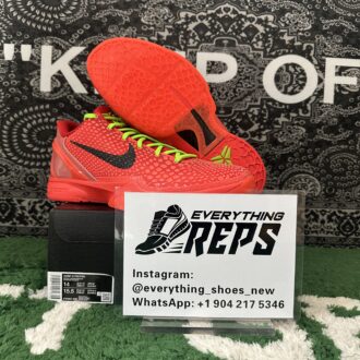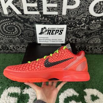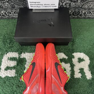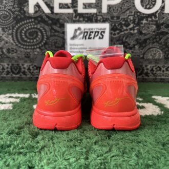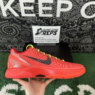 The Nike Kobe 6 Protro Reverse Grinch flips the iconic 2010 ‘Grinch’ colorway, showcasing a vibrant crimson scaly micro-mesh upper. Neon green laces and a black Swoosh provide bold contrast, while the padded low-cut collar enhances agility. Nike Kobe 6 Protro Reverse Grinch’s rearfoot stability is ensured by a molded TPU heel counter, and the lightweight Cushlon midsole houses a responsive Zoom Air unit in the forefoot for added bounce and comfort on the court. This colorway reinvents a classic with fresh energy and performance features.