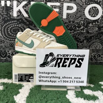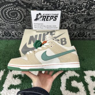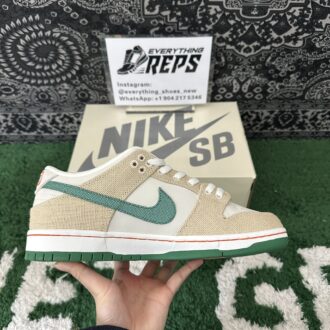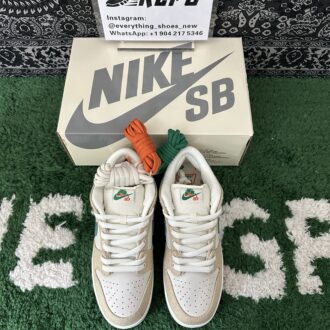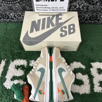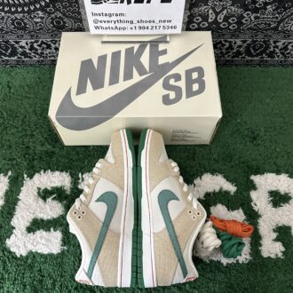 Nike SB Dunk Low Jarritos brings together vibrant design elements inspired by the beloved Mexican soda brand. The sneaker features a Phantom white leather base with hemp canvas overlays, complemented by a Malachite green textile Swoosh. The Jarritos logo is embroidered in green and orange on the lateral heel, while the woven tongue tag displays dual branding. Unique details include mismatched heel tabs, with ‘Nike’ and ‘Jarritos’ embroidered on each shoe. A white rubber cupsole with a two-tone green and orange outsole rounds out the bold, playful look.