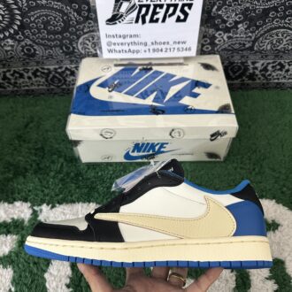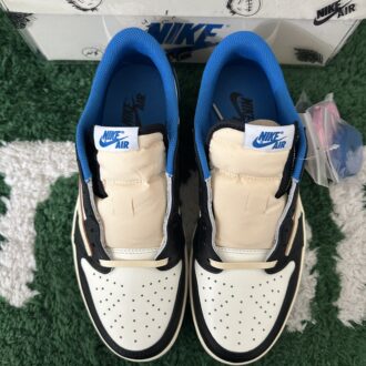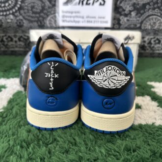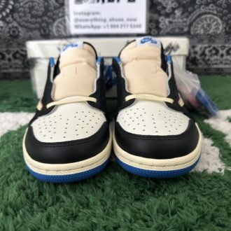 The Air Jordan 1 Low Fragment Design x Travis Scott is a collaboration that fuses signature elements from both Travis Scott and Hiroshi Fujiwara’s renowned brand. The color scheme pays homage to previous Fragment collaborations, featuring a white leather upper with striking overlays in black and royal blue. Scott’s distinctive oversized Swoosh in an off-white hue embellishes the lateral side, while a standard black Swoosh graces the opposite side. Air Jordan 1 Low Fragment Design x Travis Scott’s “Cactus Jack” branding and the rapper’s iconic smiley face logo adorn the left shoe’s heel tab, while the right shoe showcases a combination of the classic “Jordan Wings” logo and Fragment’s “lightning bolt” trademark.