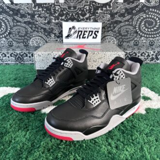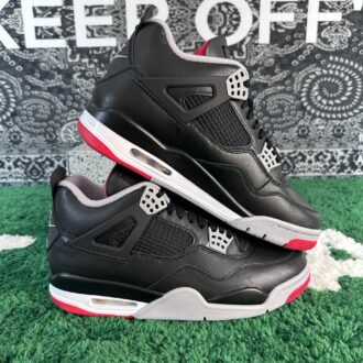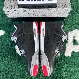 TheAir Jordan 4 Retro Bred Reimagined updates the classic design with a black leather upper, replacing the original 1989 nubuck. Key features include quarter panel netting, grey molded eyelets, and Nike Air branding on the heel tab. The woven Flight tag on the tongue showcases a crimson Jumpman logo. Air Jordan 4 Retro Bred Reimagined, lightweight polyurethane midsole includes encapsulated Air-sole cushioning in the forefoot and an exposed Air unit in the heel. A pre-distressed rubber outsole with a herringbone traction pattern ensures superior grip.