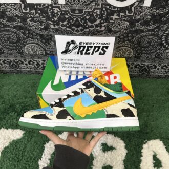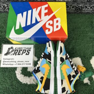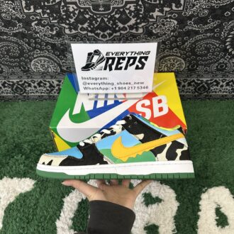 Collaborating with Ben & Jerry’s, Nike SB Dunk Low Ben & Jerry’s Chunky Dunky draws inspiration from the packaging of the Chunky Monkey ice cream flavor. The leather upper showcases vibrant blue skies and lush green pastures, while pony hair overlays display a playful spotted cow print. A yellow leather Swoosh is creatively designed to resemble melting ice cream, adding a unique visual element. The woven label on the tongue features the distinctive Chunky Dunky stripe alongside the Nike SB logo, completing the whimsical design.