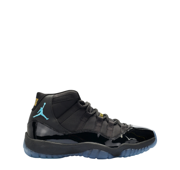 The Air Jordan 11 Retro ‘Gamma Blue’ was the 2013 holiday release from Jordan Brand. This non-OG colorway features a sleek black upper made from ballistic mesh and shiny patent leather. Pops of color come from the turquoise Jumpman logo and Varsity Maize ‘23’ on the heel tab. The design includes a cushy Phylon midsole with a full-length Air unit, a carbon fiber spring plate, and a translucent rubber outsole with herringbone traction pods for superior grip.